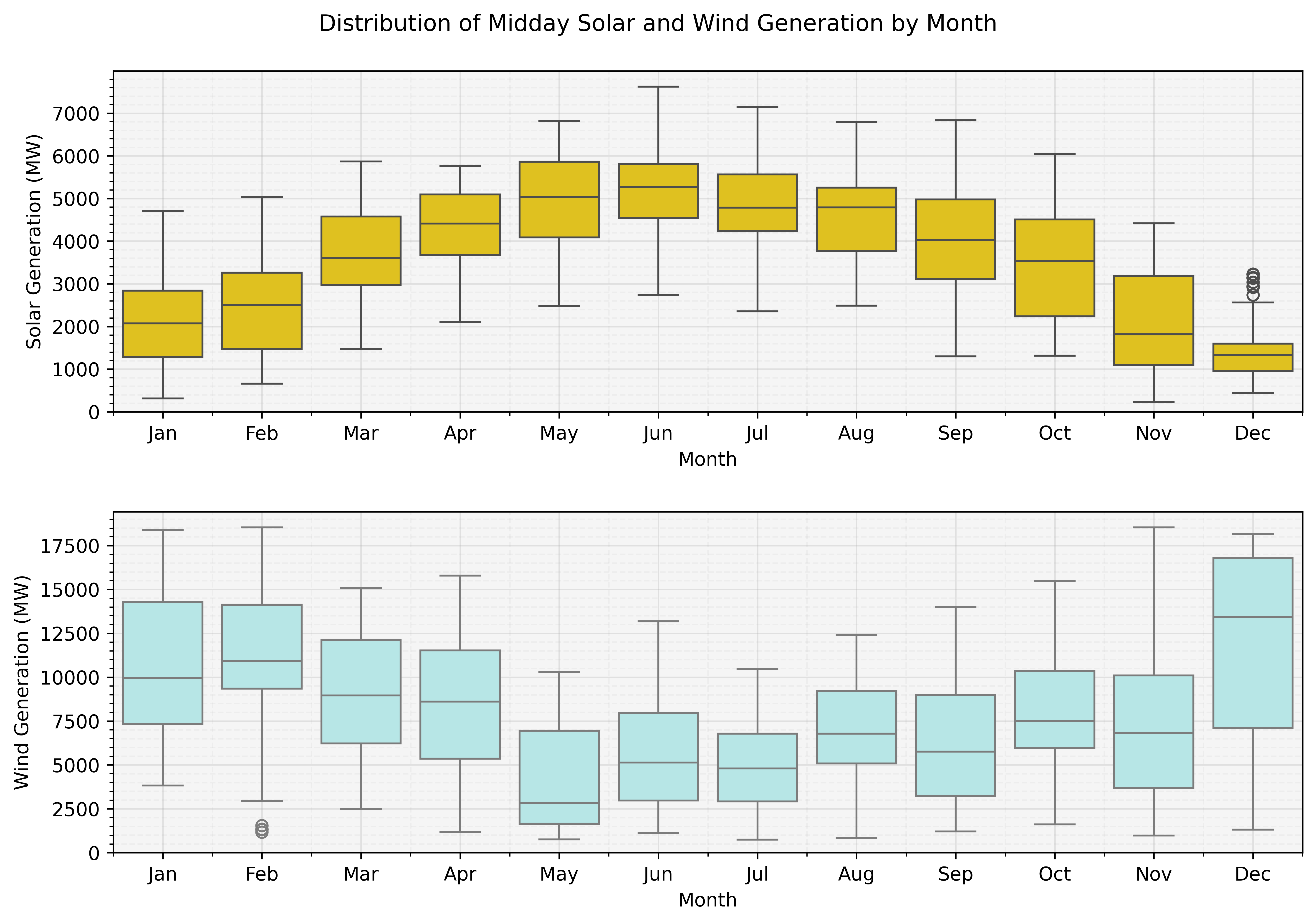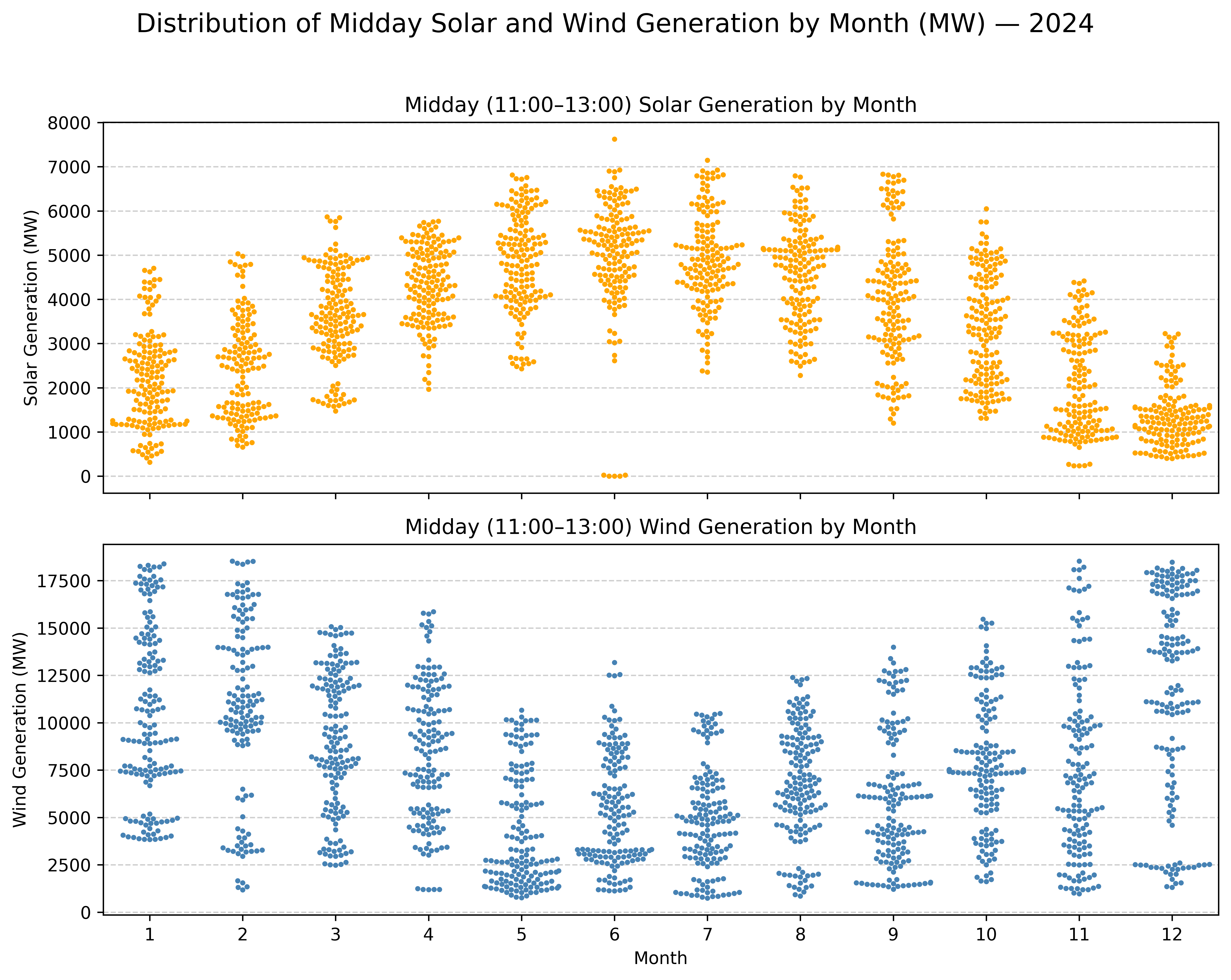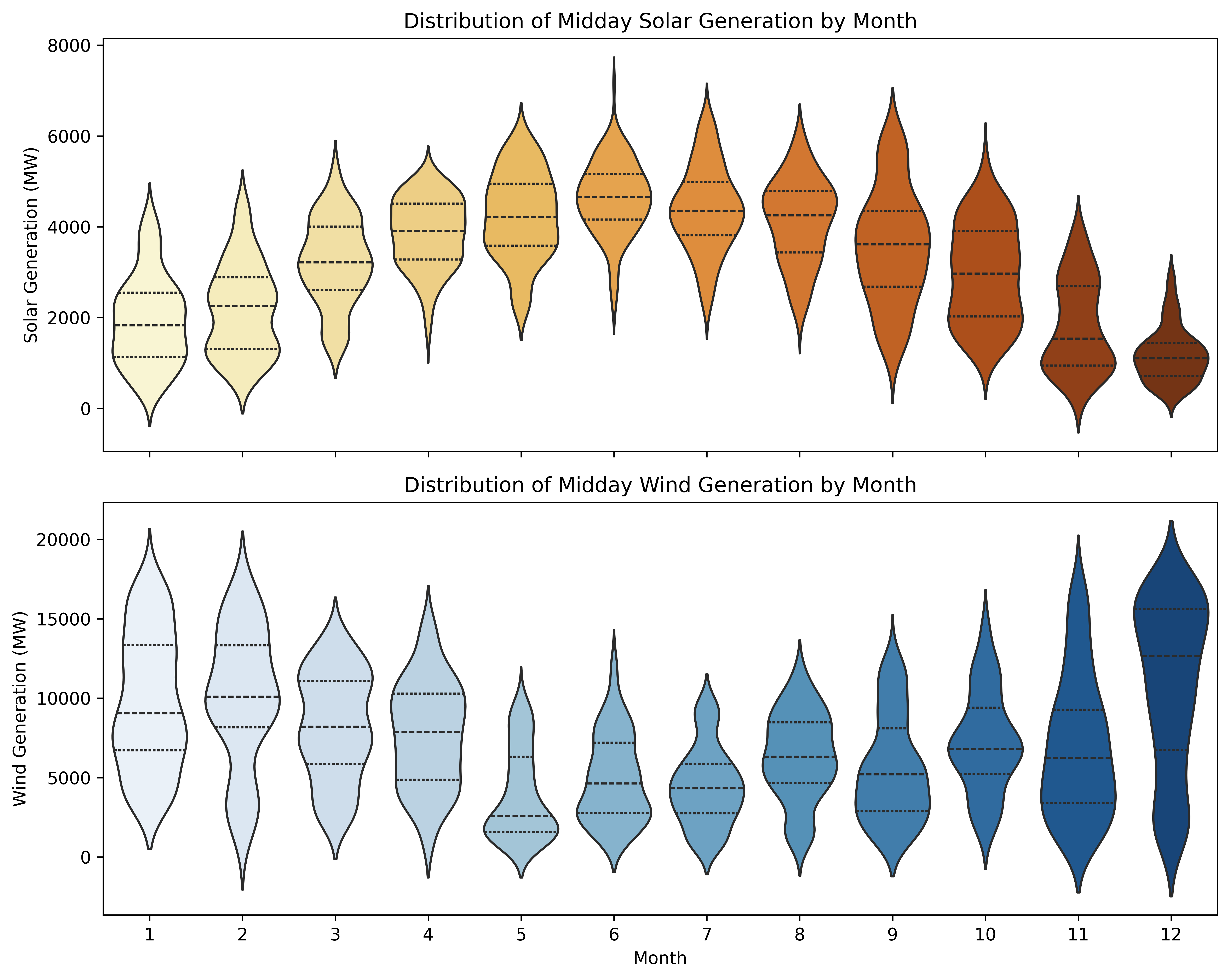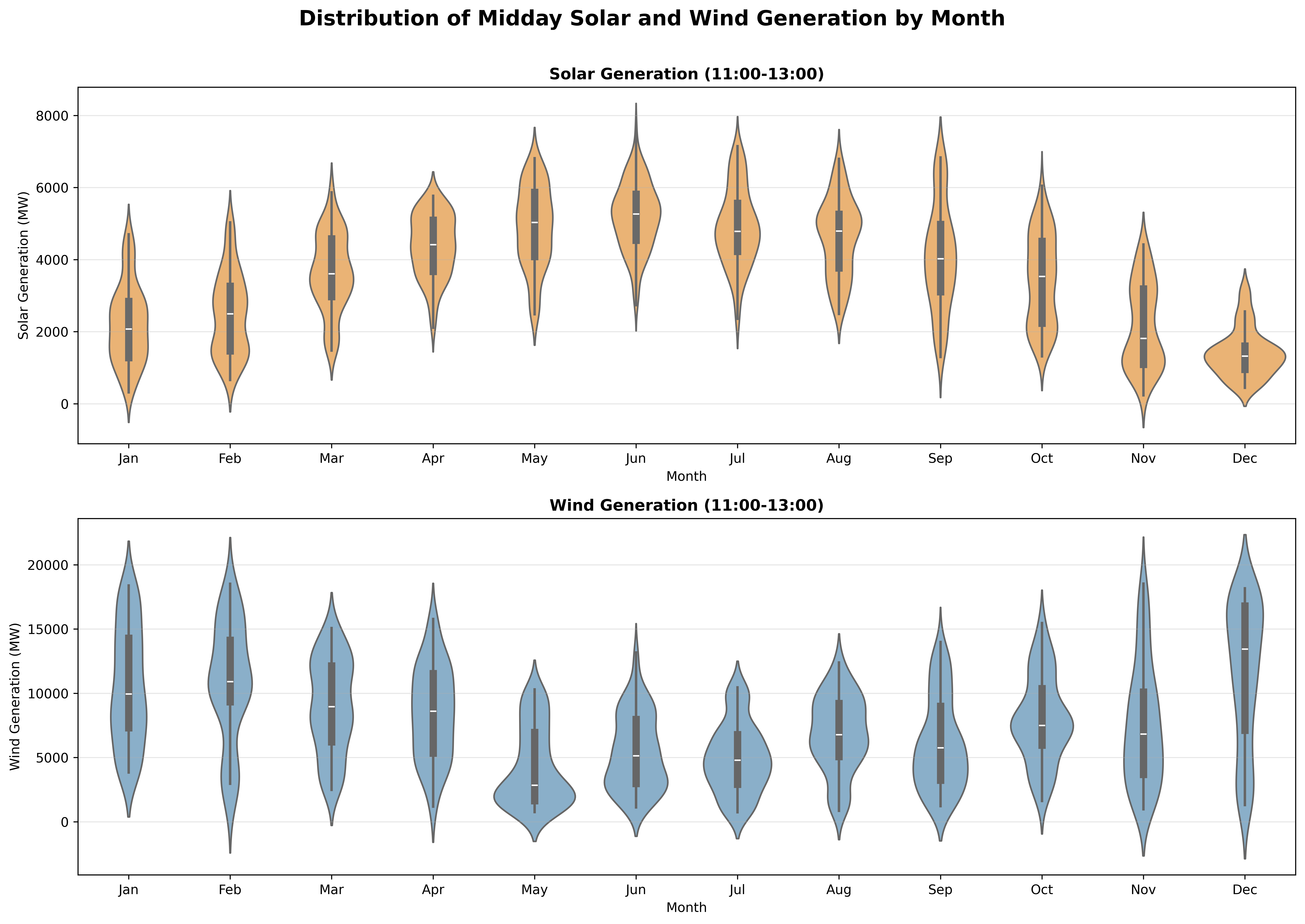 "Distribution of Midday Solar and Wind Generation by Month"