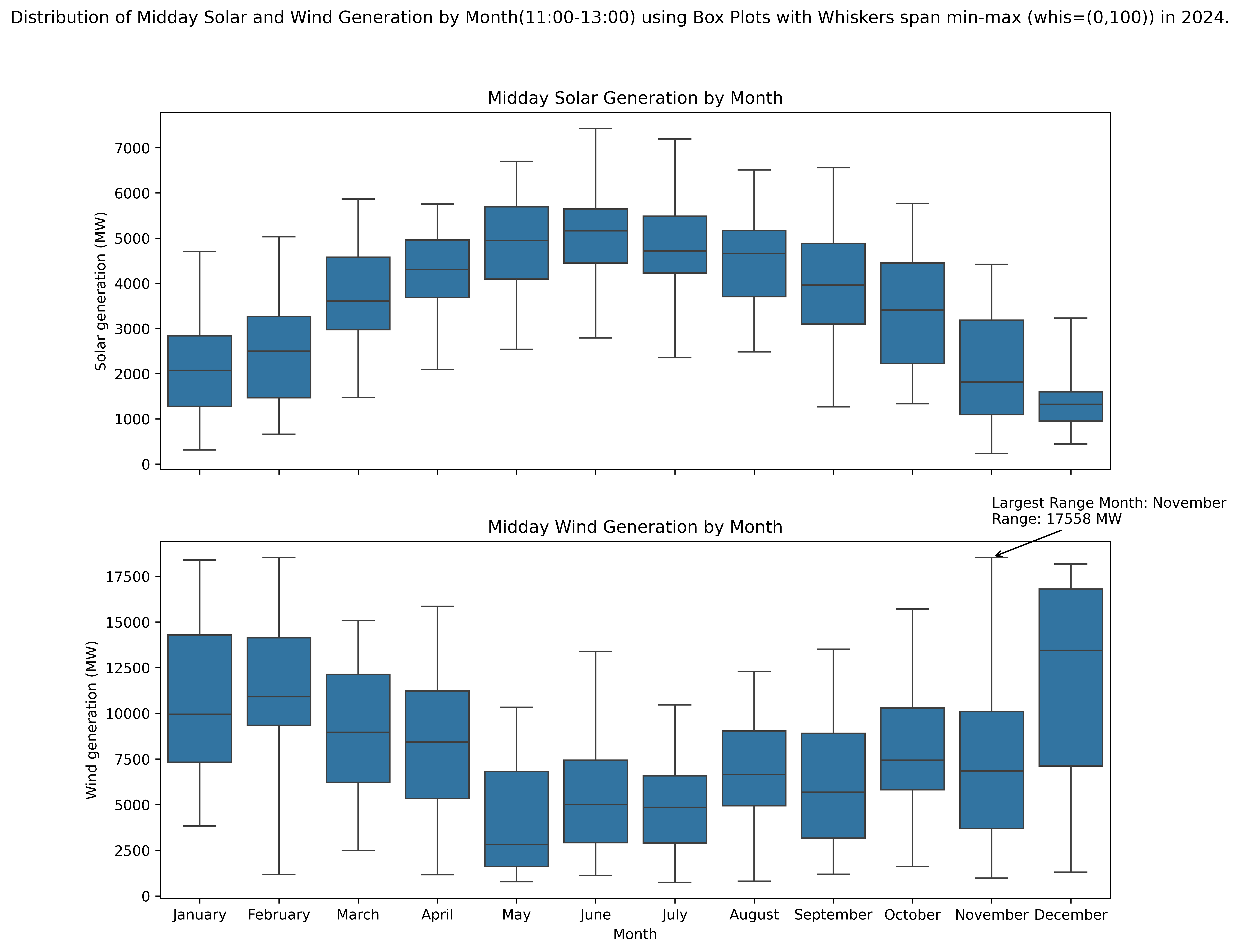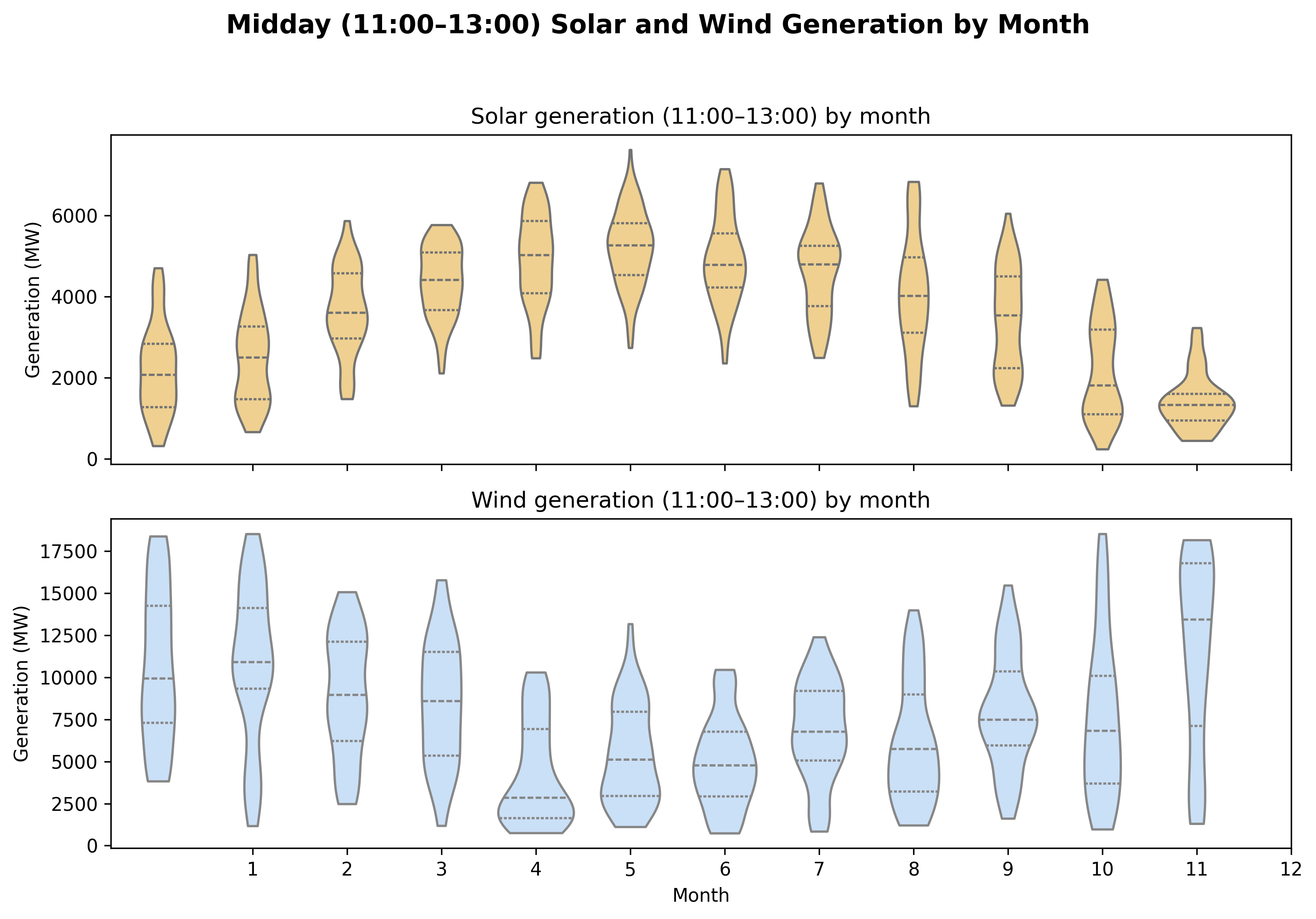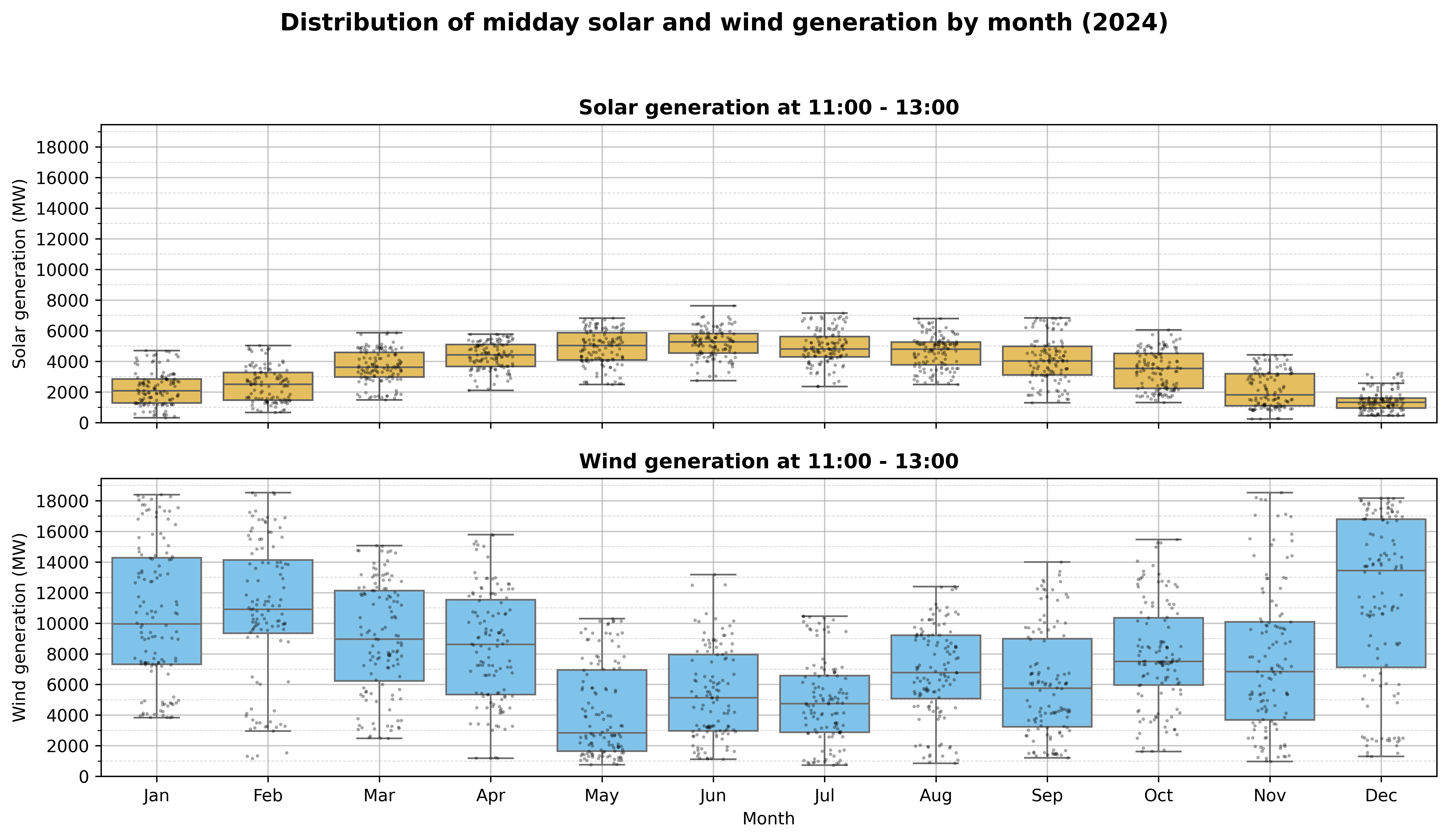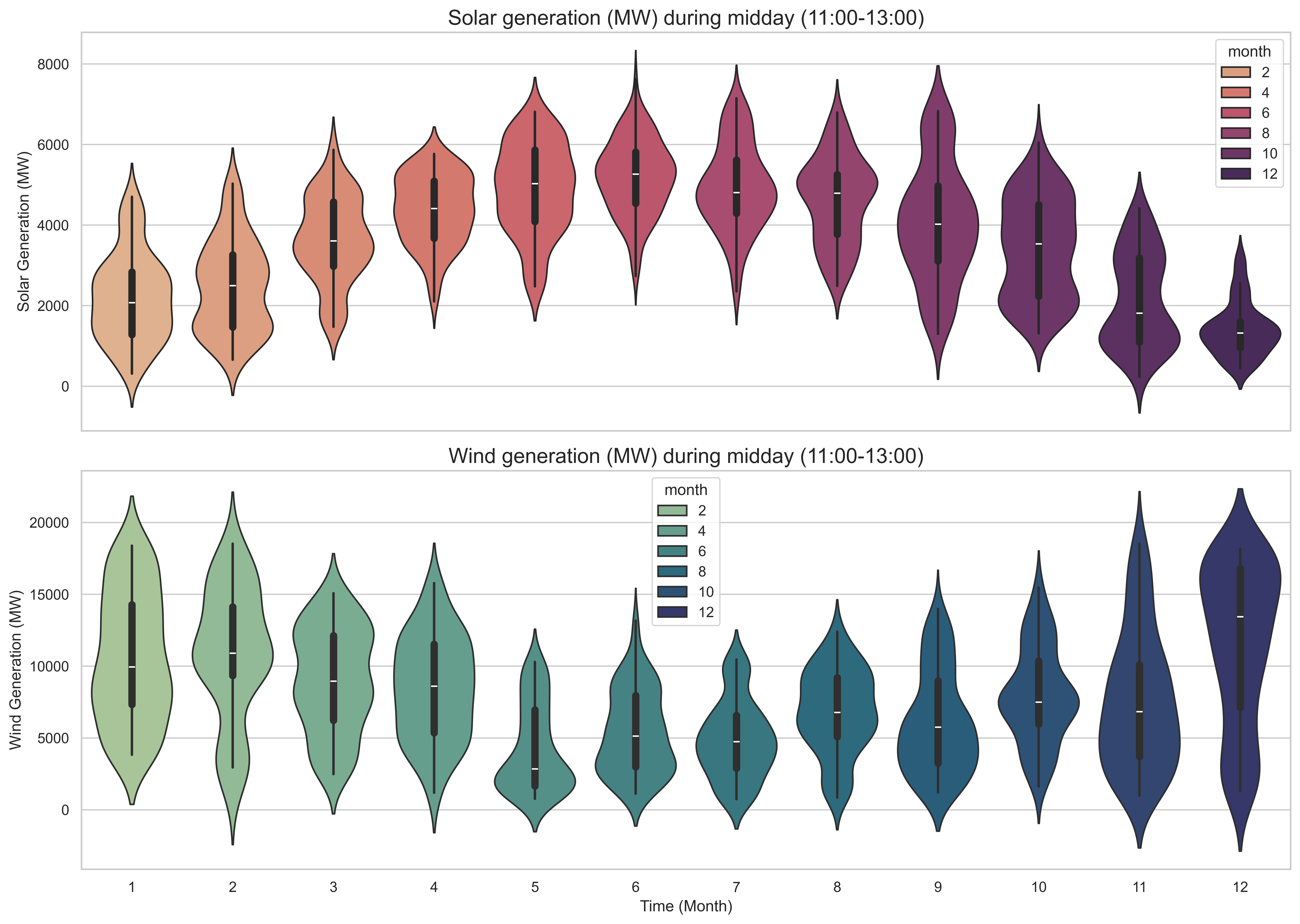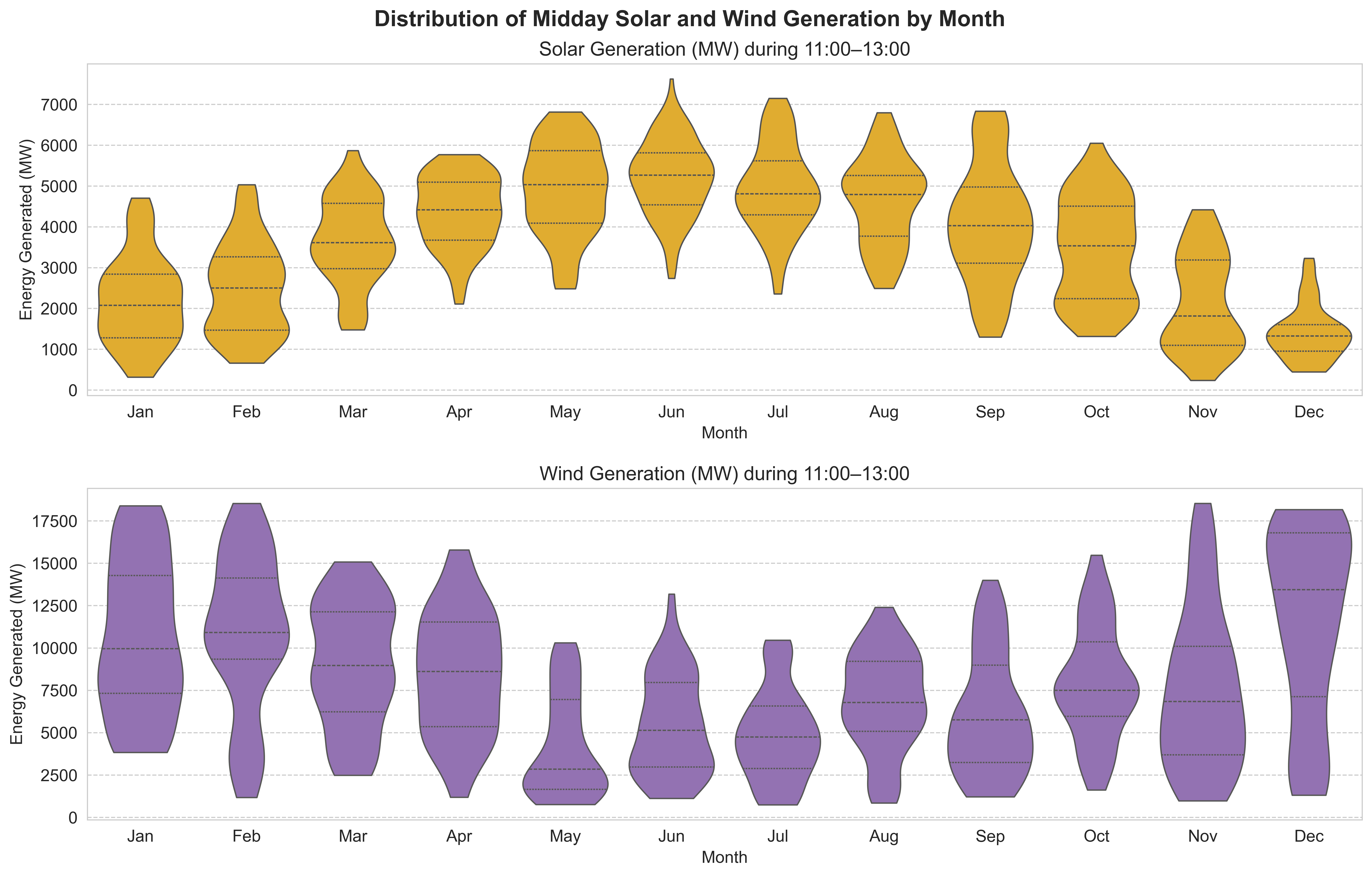 "Distribution of Midday Solar and Wind Generation by Month"