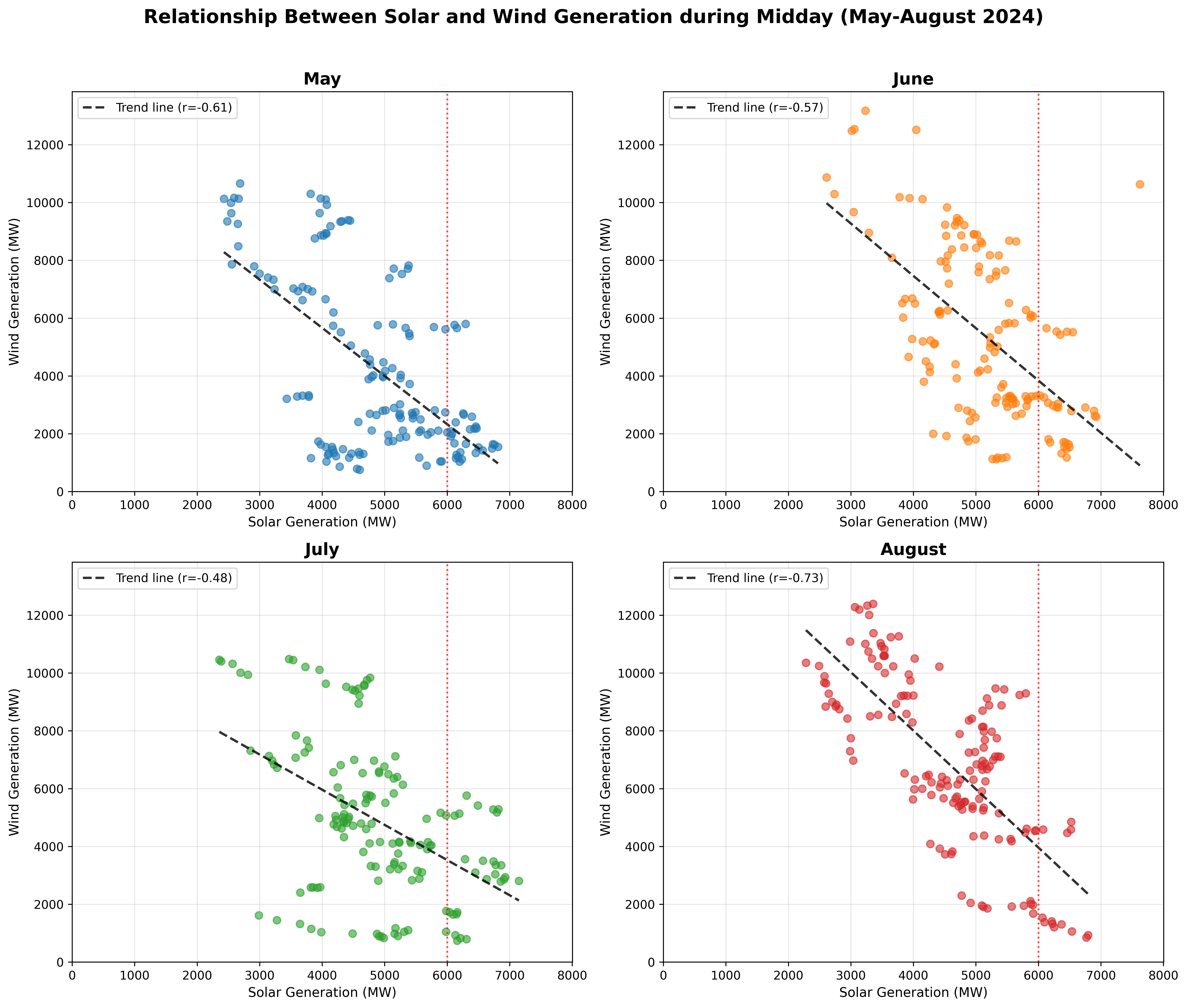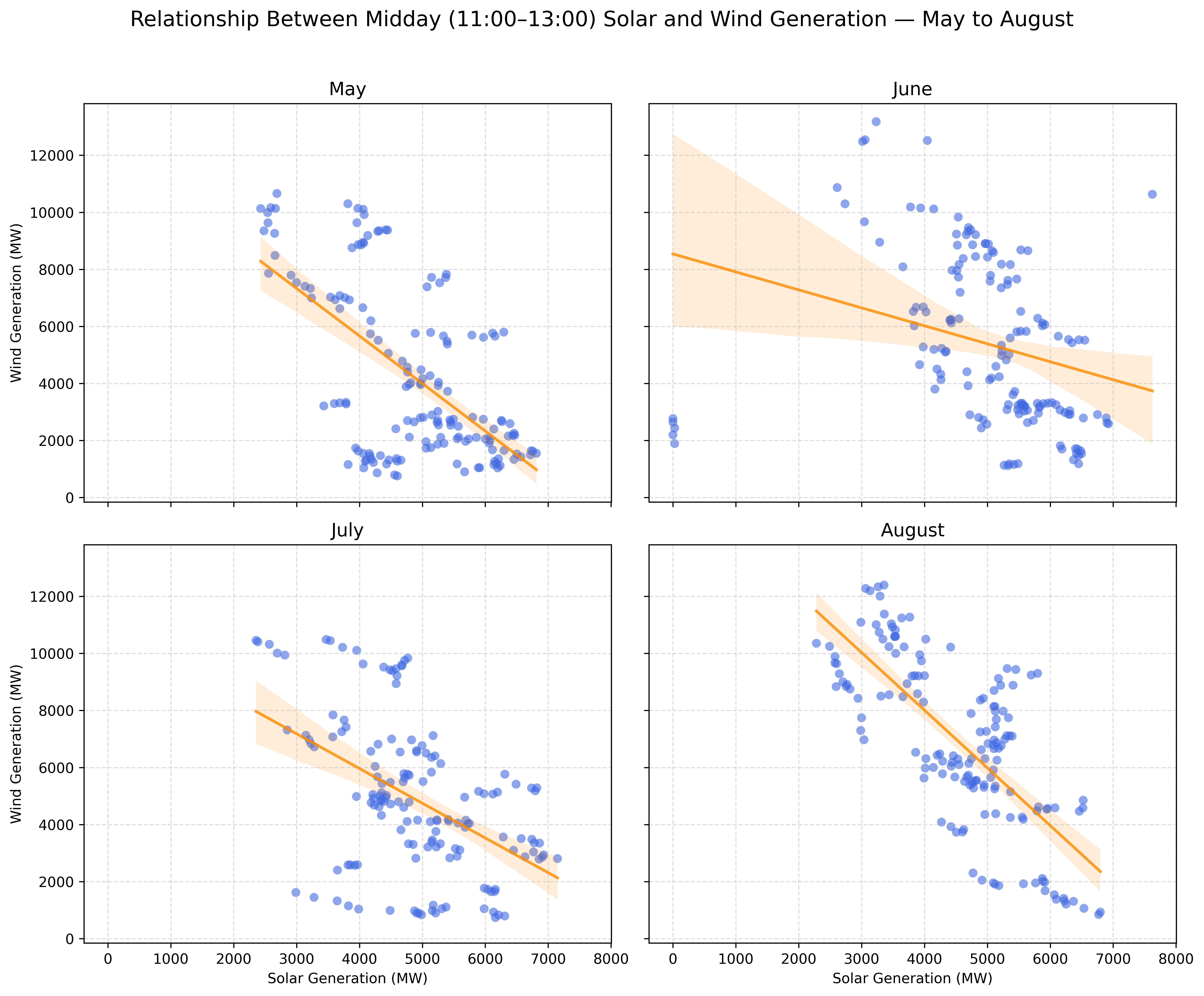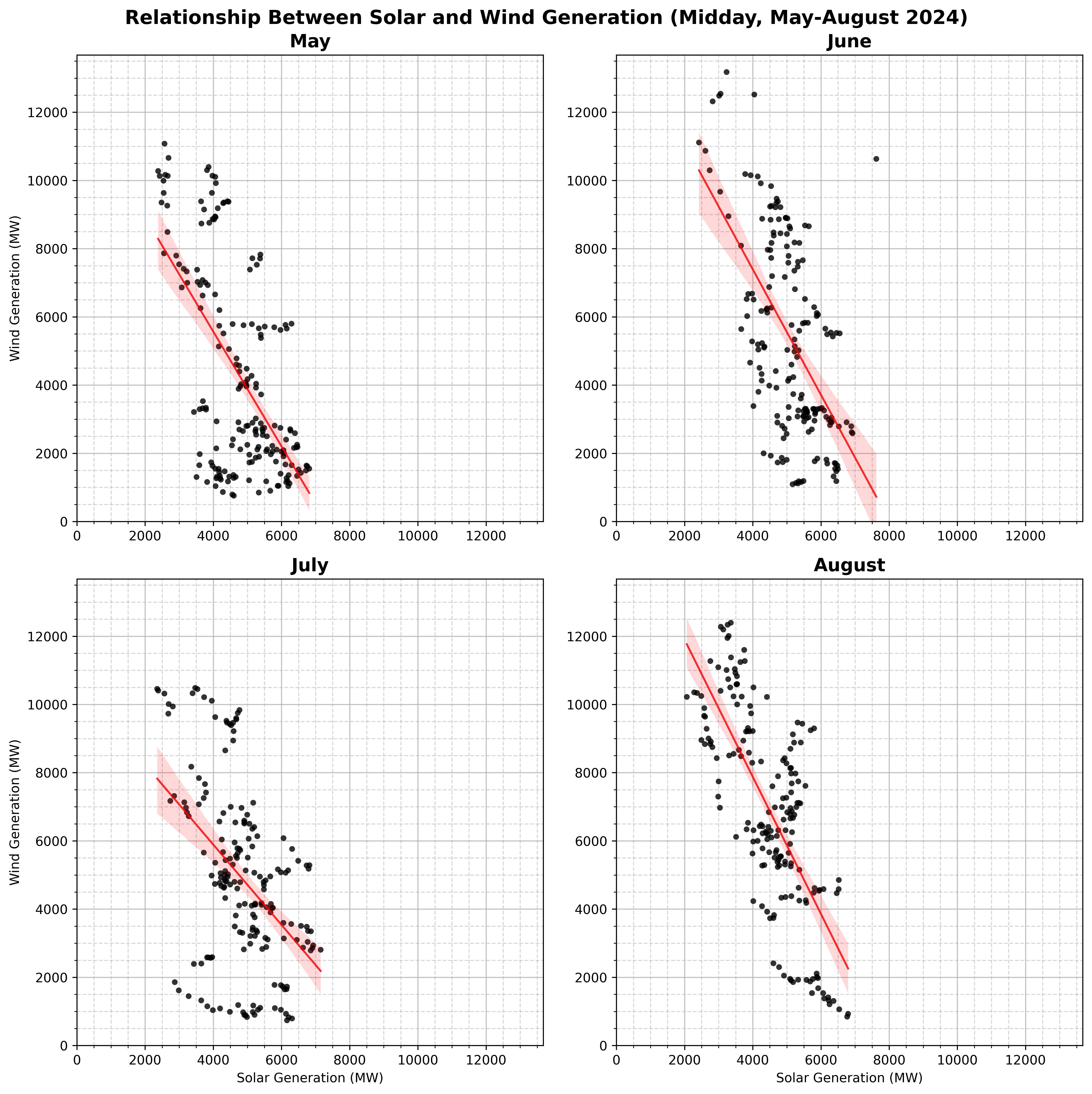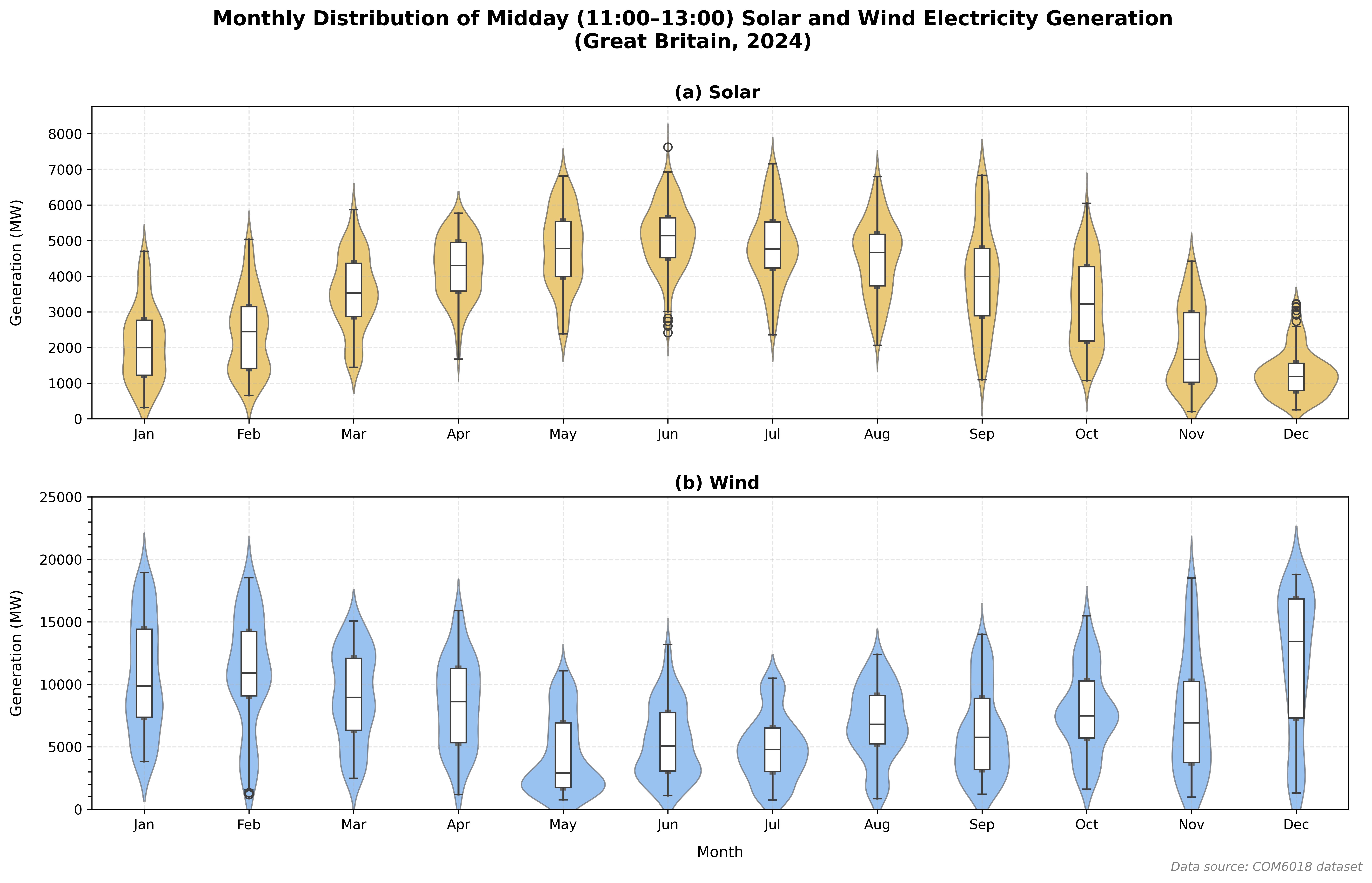 "Distribution of Midday Solar and Wind Generation by Month"
